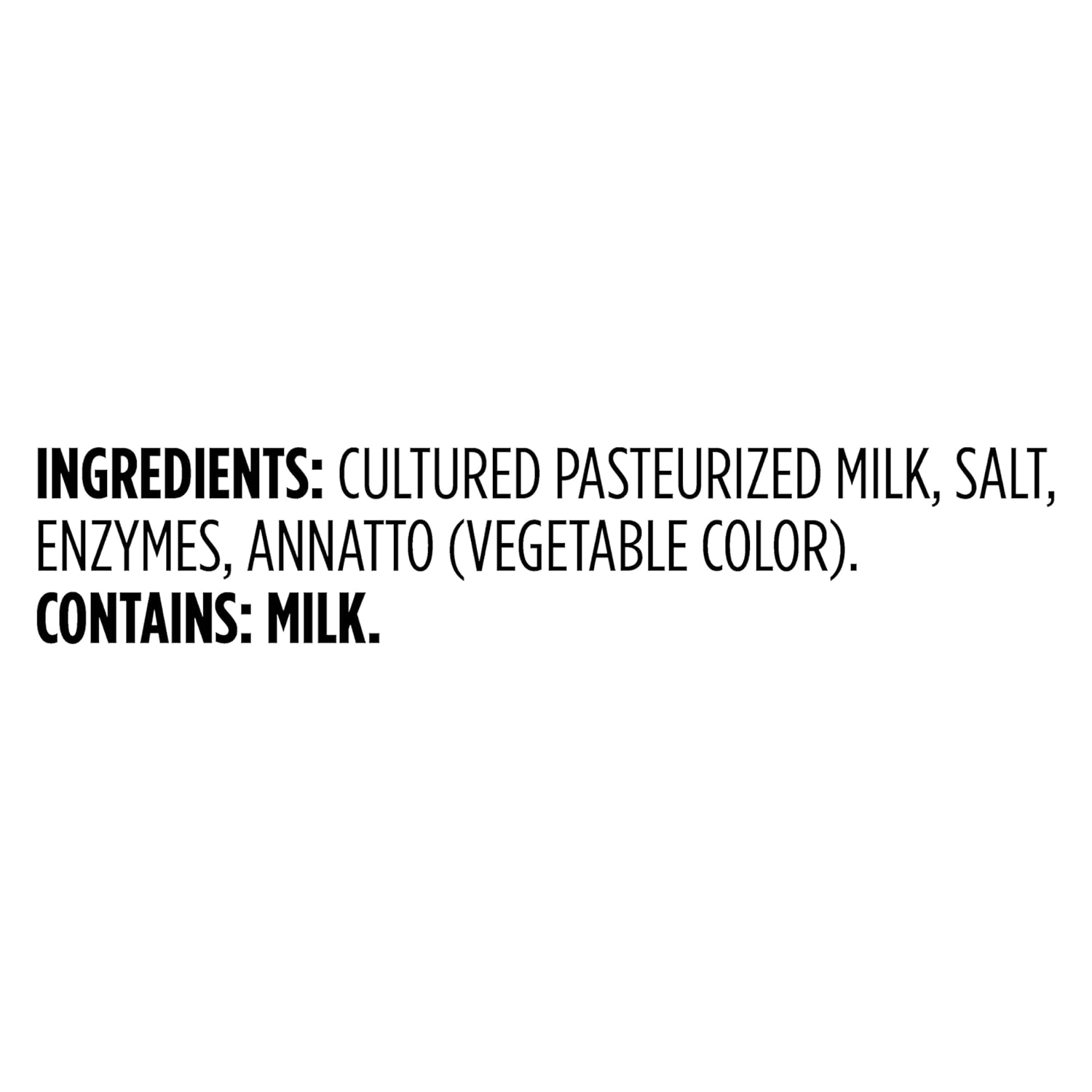 CHEDDAR CHEESE (PASTEURIZED MILK, CHEESE CULTURE, SALT, ENZYMES, ANNATTO [COLOR]).<br/><br/>CONTAINS: MILK
